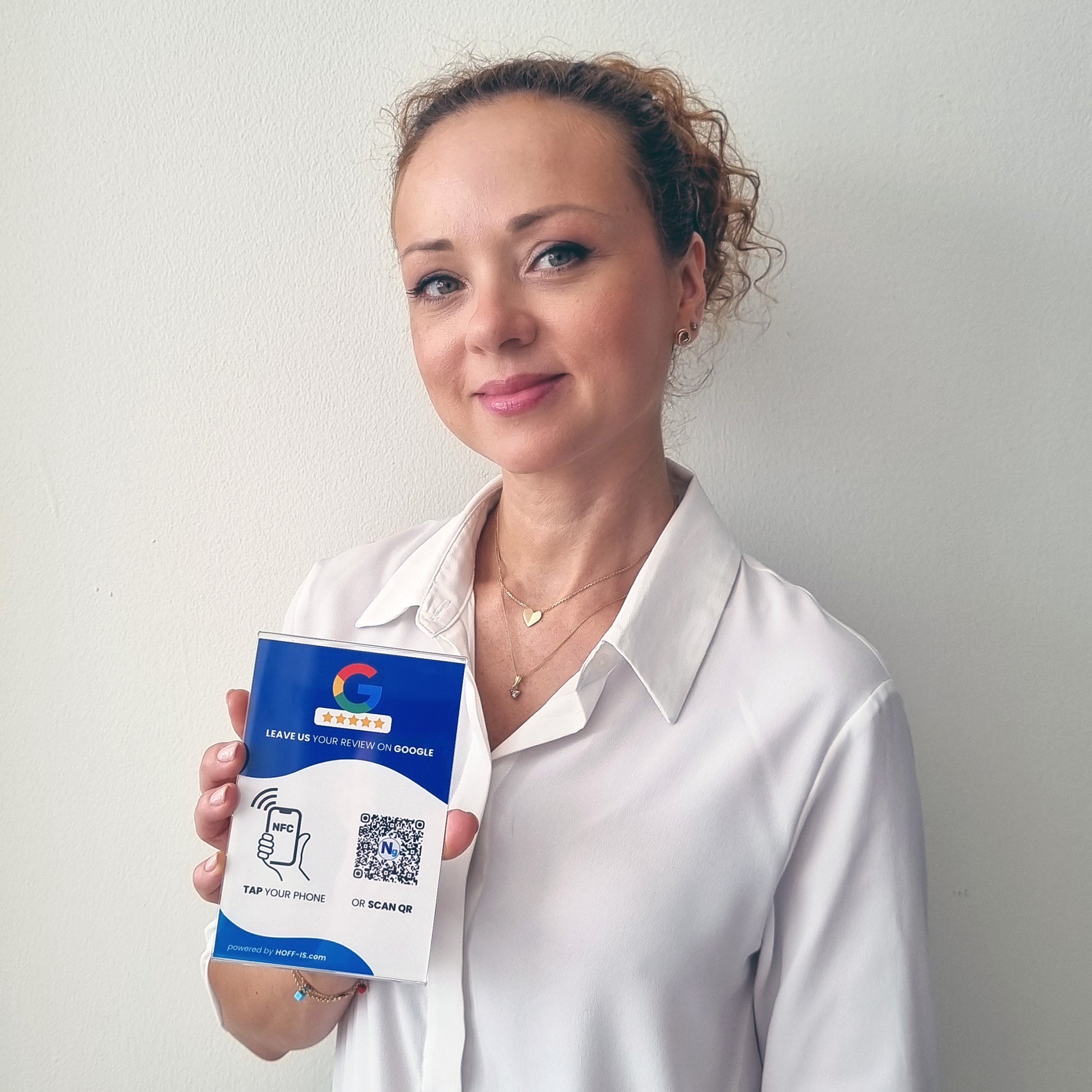 Help your customers quickly leave reviews of your business. Enhance your reviews with our NFC / QR Code online stands for Google reviews.